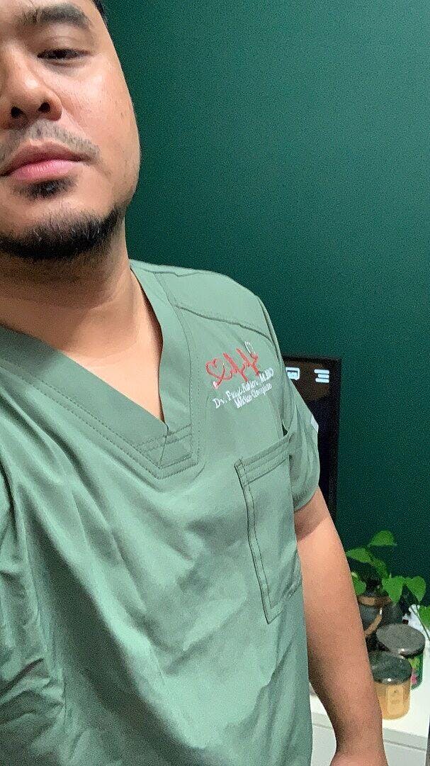 A Men’s Athletic fit V-neck top features a chest pocket with grommet detail, front welt pockets with triple-needle topstitching, front and back yokes, and stretch rib knit back panels for extra comfort. Center back length: 29 1/2”. The comfortable stretch poplin fabric and super stretchy rib knit is the perfect combo for healthcare professionals.
